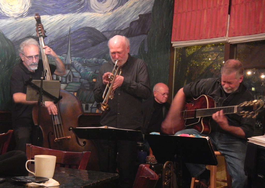 Steve is the drummer, Chuck plays 7-string guitar, Bruce is on upright bass, and Al plays trumpet & flugelhorn. We’ve been playing together in various overlapping groups for many years, but this quartet is truly special and reflects a solid set of shared musical values.